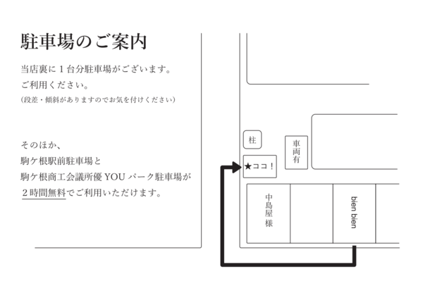 電車の場合 飯田線駒ヶ根駅を出て、広小路通りを西へ約2分。 左側アーケードをおよそ 250m程。 高速バスの場合 駒ケ根バスターミナルから徒歩1分。スクランブル交差点を斜めに渡ってください 。 自動車の場合 中央道駒ケ根インターチェンジから3km。 当店裏駐車場1台・駒ヶ根駅前駐車場 2時間無料・駒ケ根商工会議所優YOUパーク駐車場2時間無料ををご利用ください。